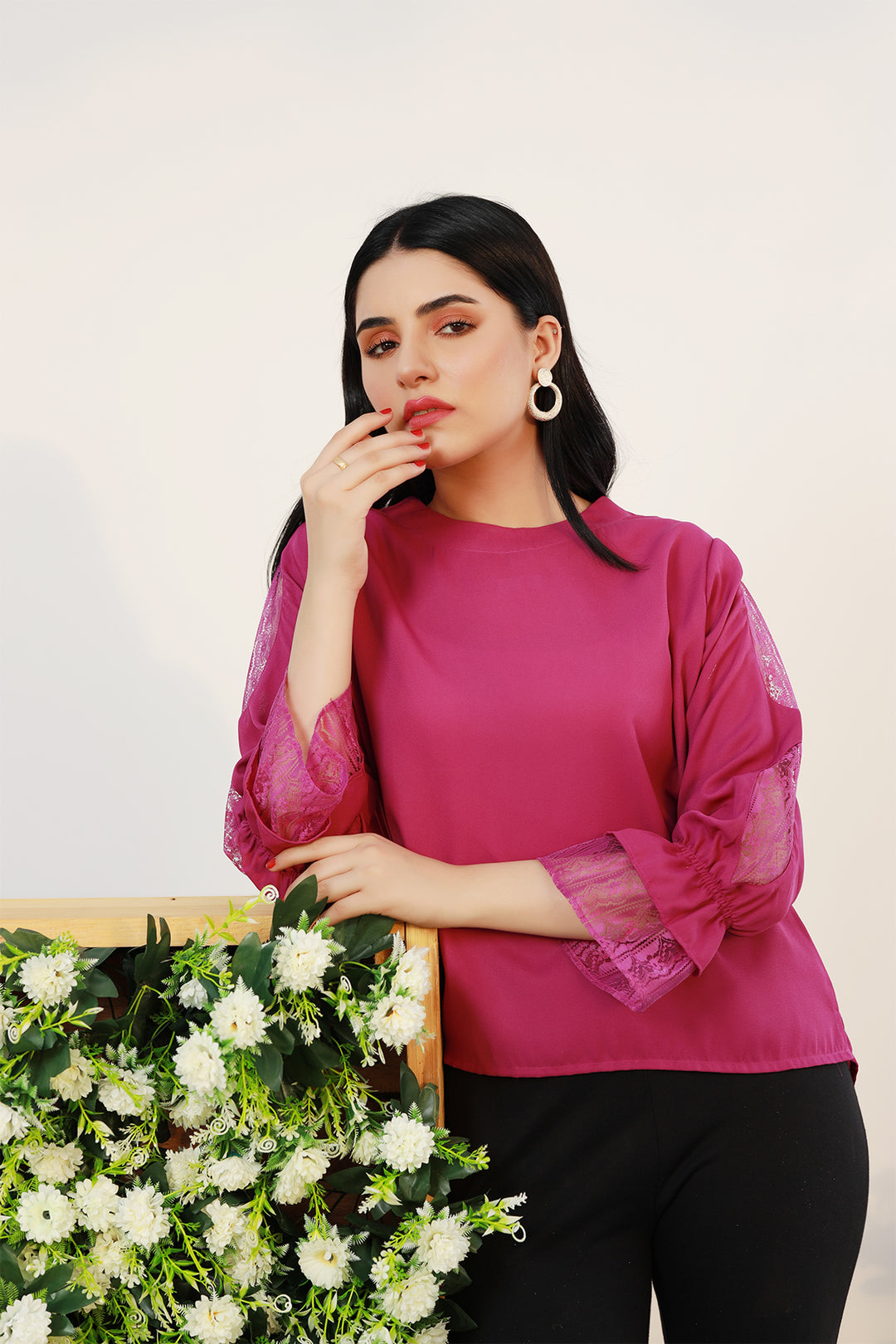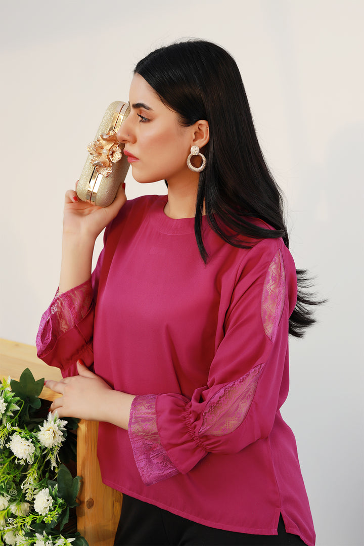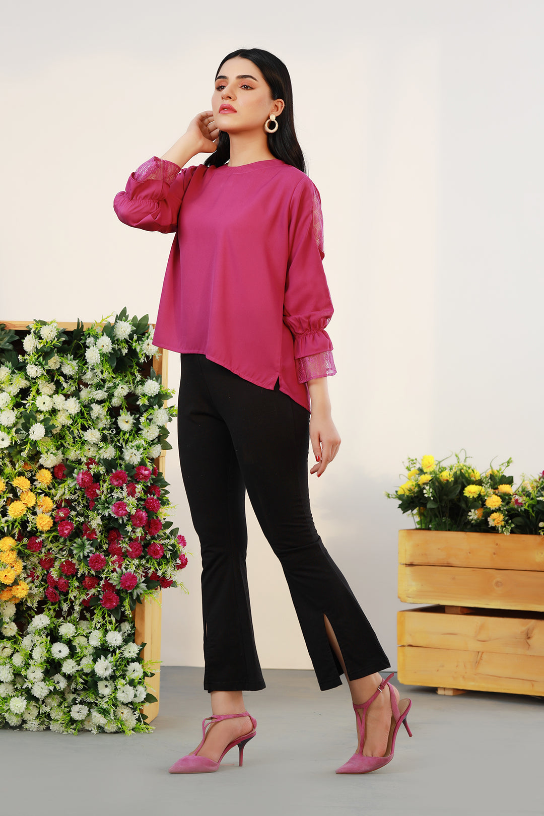 Keep your work mode on, and be the delicate beauty on a powerful duty. Adding flare to your formal work-wear comes party-wear with Fuchsia Fey Top. This top has all the vibes of feeling electrified on the hectic workday. It features a boat neckline, peek-a-boo sleeves with net fabric emphasis, and frilled sleeve hem. A perfect match for your vibrant and lively personality.