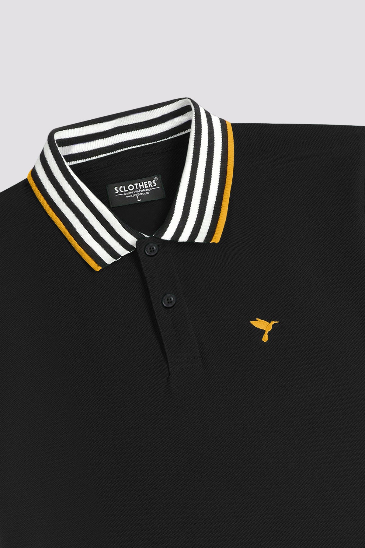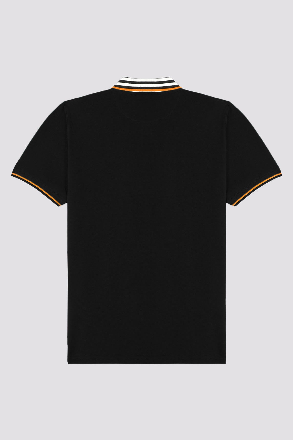 Pick a simple yet sophisticated Black Contrasting Striped Yarn Dyed Collar Polo Shirt from our latest collection. Designed in the cool tones of White, Black & Rust with a contrasting yarn dyed striped collar and a bird emblem. Choose perfection and strive for it.