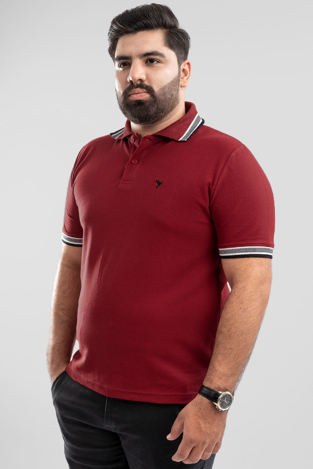 Self-express your class and style in Red, White, Grey & Black Contrasting Jacquard Collar Polo Shirt featuring a embroidered bird emblem on the front. It is made with premium pique fabric to ensure long-lasting quality and comfort.