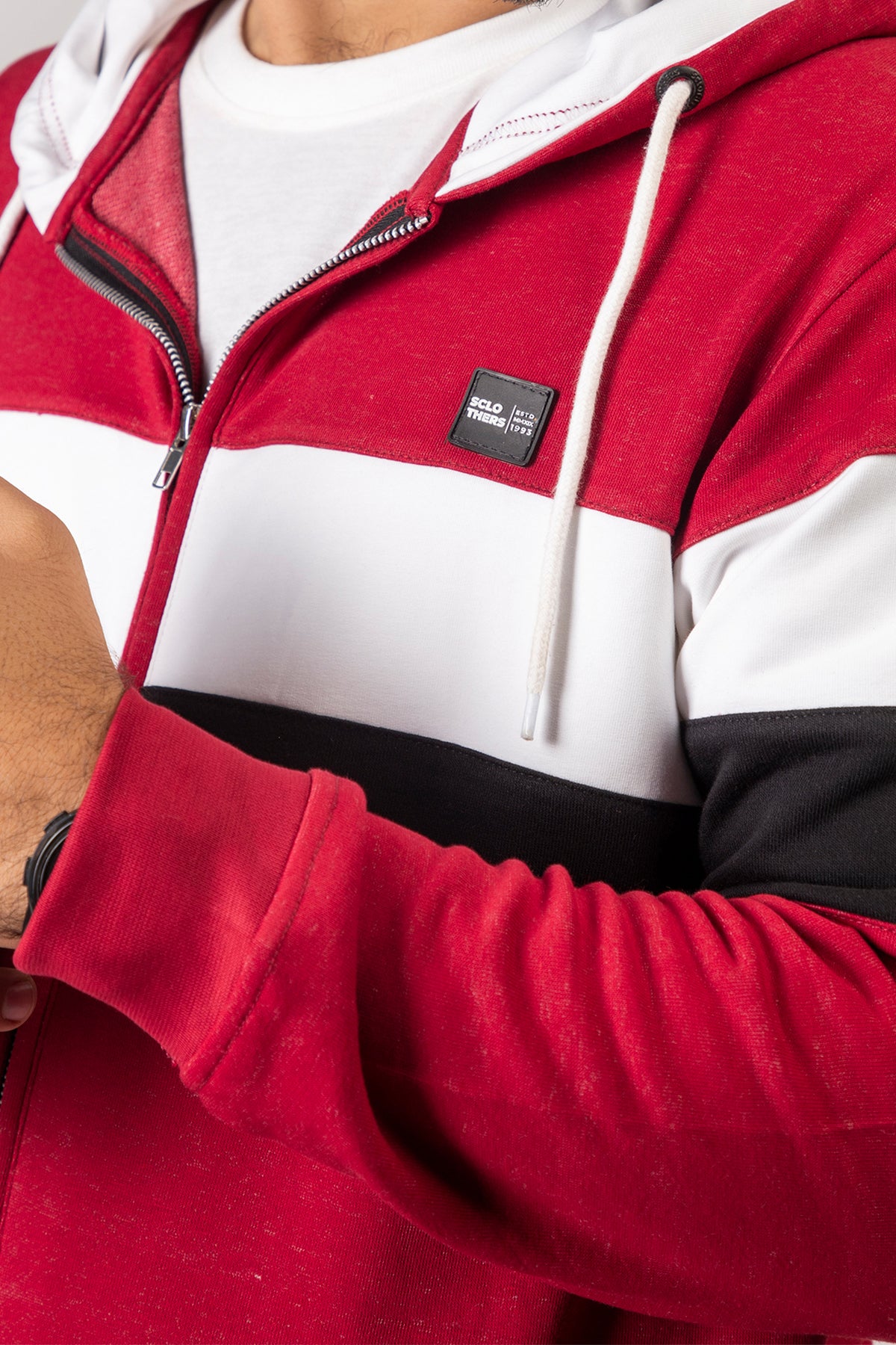 Stay warm in style with this Maroon Tri-Color Zipper Hoodie. Its unique color palette and precise details will ensure a comfortable and fashionable fit. Durable fabric and high quality stitching ensures this hoodie will last for years to come. With a fitted silhouette, this hoodie is perfect for any season.