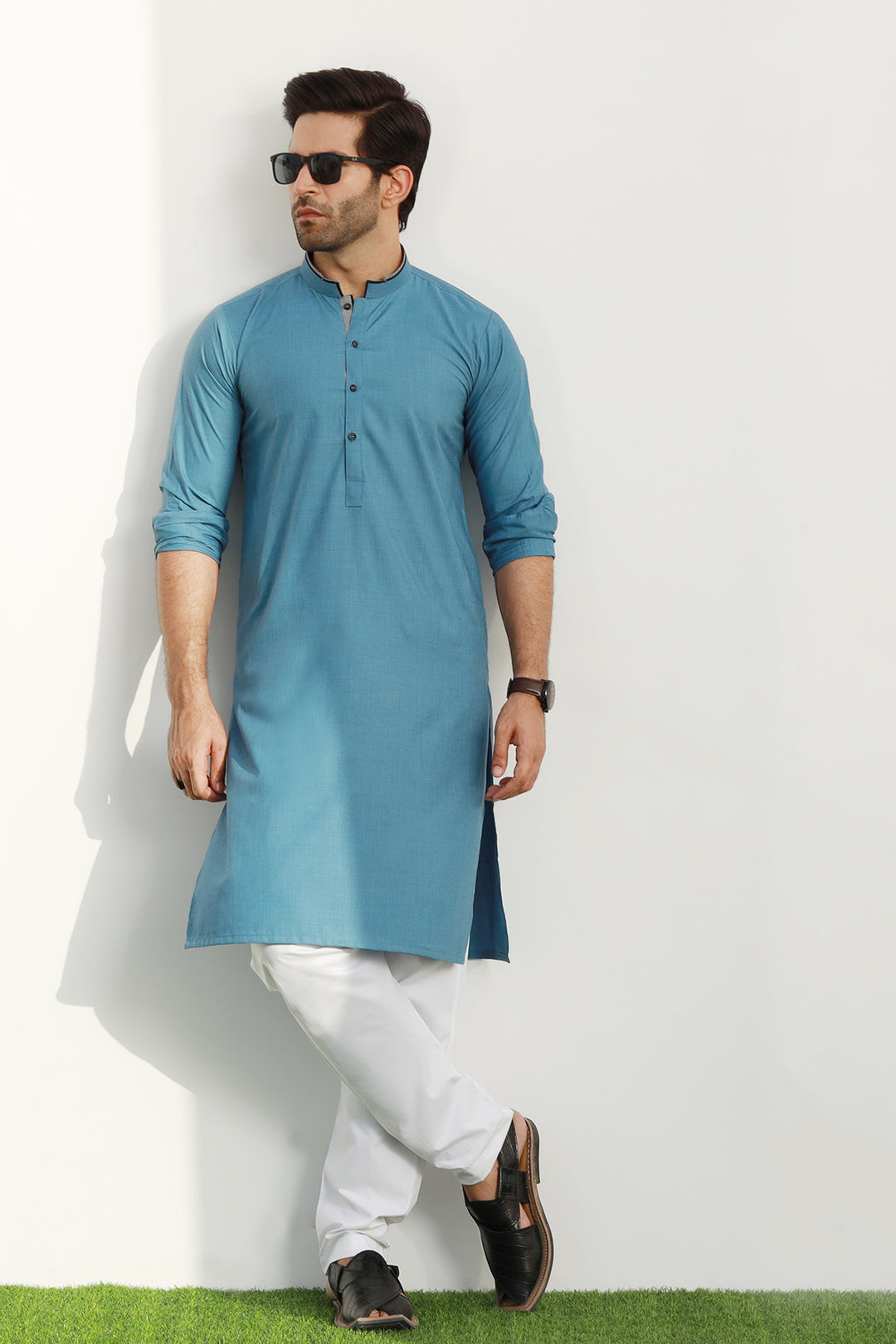 Give the cool twist to your traditional outfit with our Faded Denim Blue Kurta in a pastel palette with intricate piping and contrast detailing on the collar and placket. Don’t fit into this world, just make your own.