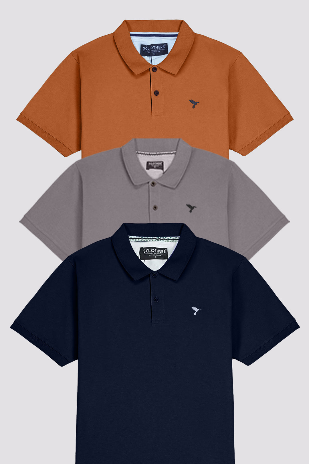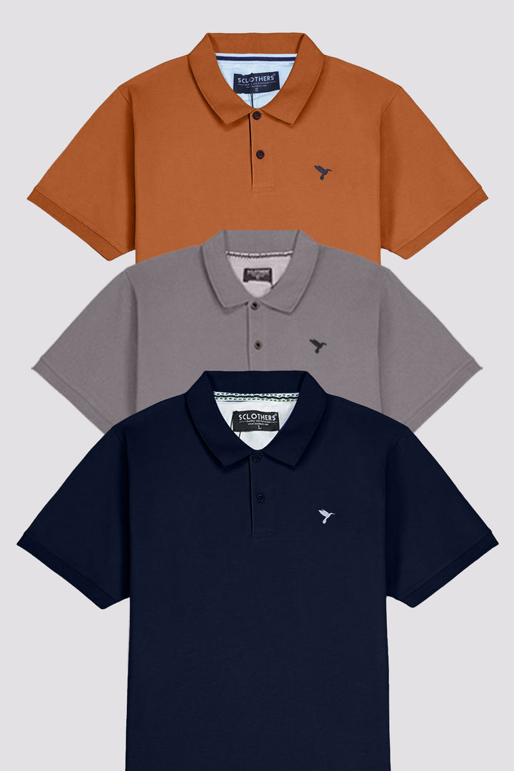 Enhance your wardrobe with this pack of three luxurious polo shirts. Each shirt features a unique embroidered design in sophisticated steel gray, warm cinnamon, and classic navy blue. Elevate your style with these premium polo shirts.