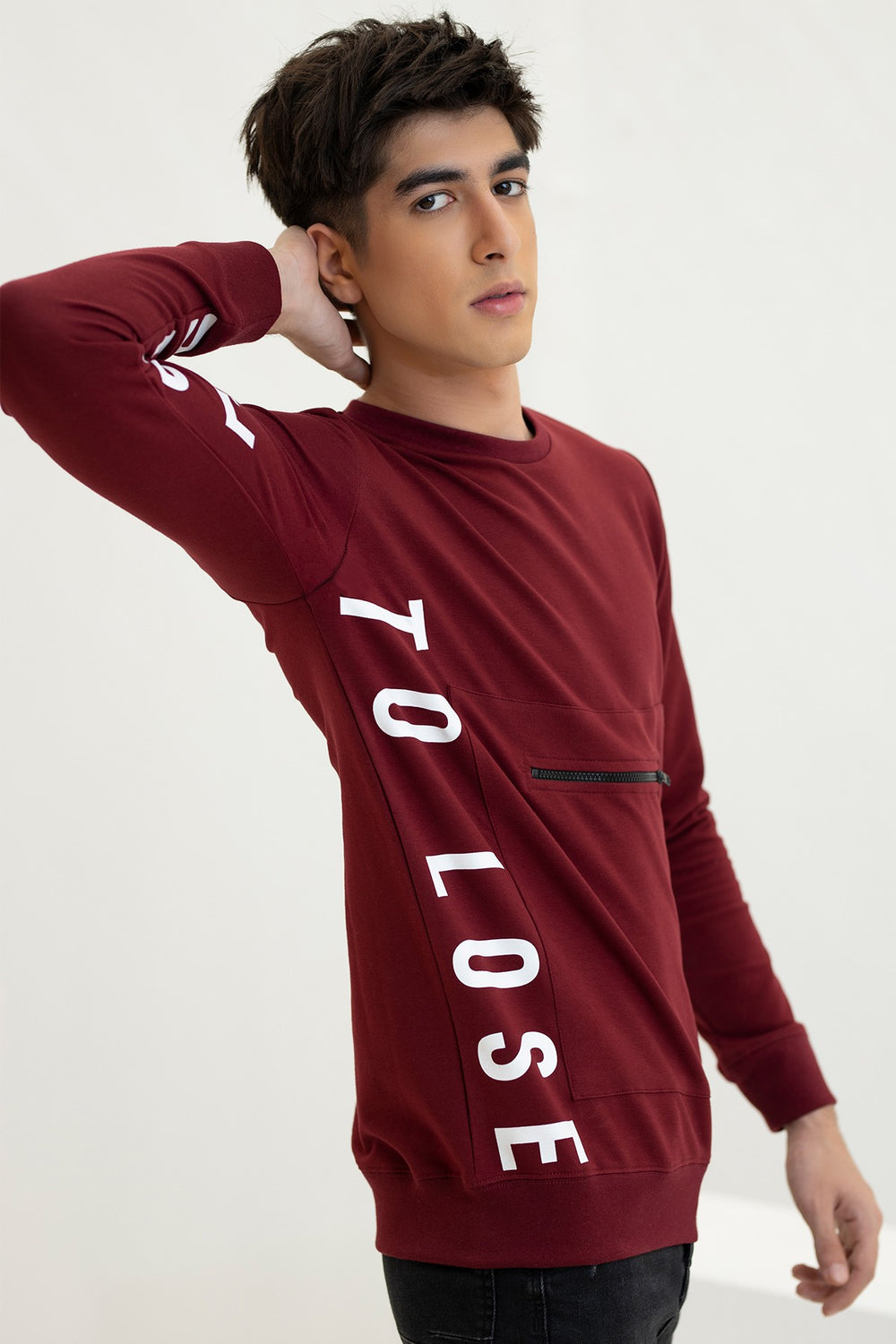 A very soft and comfortable wardrobe essential, this maroon Sweatshirt features a ribbed crew neckline, a zip pocket at the front, and a neatly ribbed hem for a complete fit. A motivating 'REFUSE TO LOSE' graphic print on the back sleeve, down to the hem.