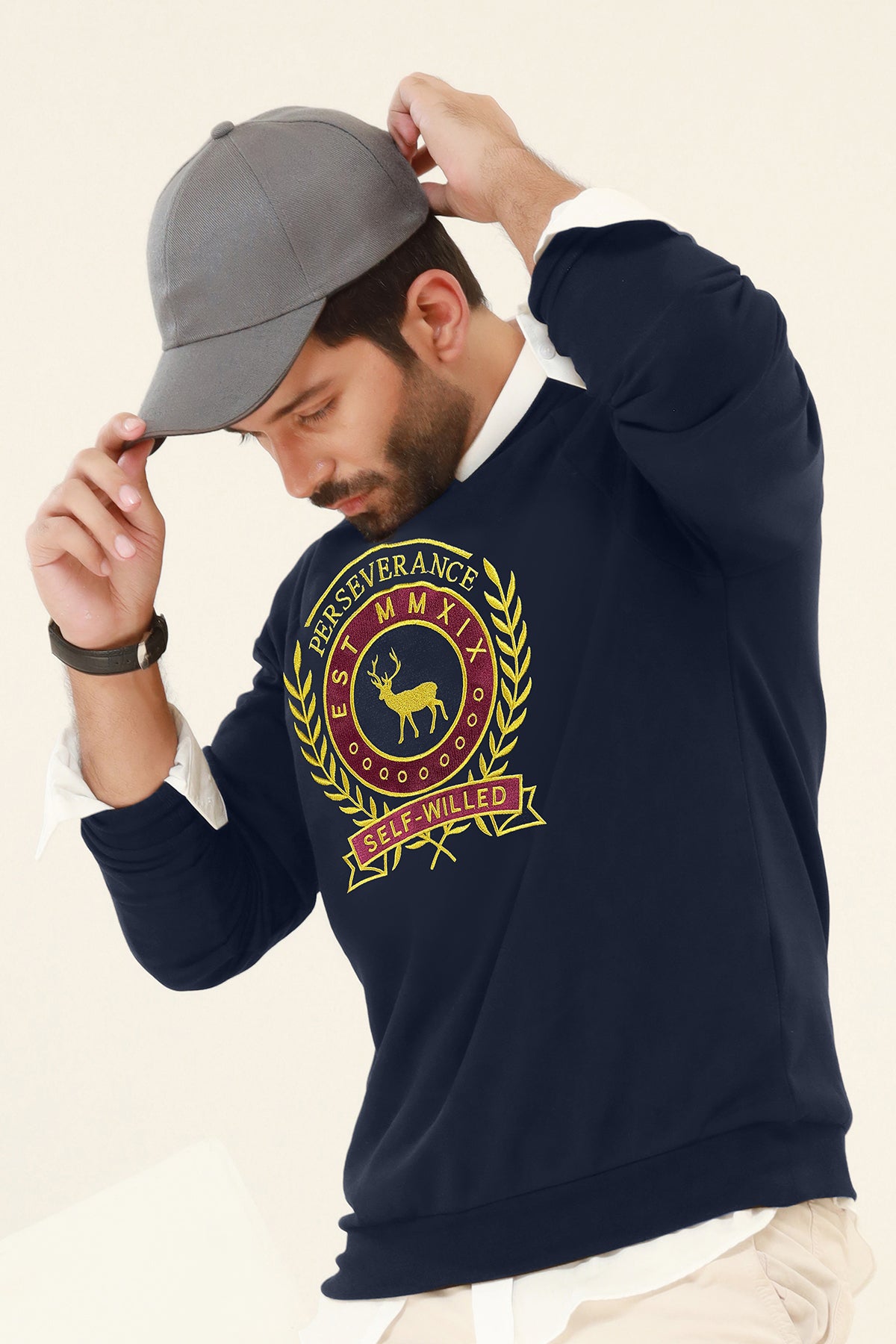 This premium comfortable Self-Willed Dark Blue Sweatshirt is adorned with Sclothers emblem pasted with black & gold color over the chest. Made with Soft and skin Friendly terry fabric, it guarantees comfort and durability and can be paired with the vast choice of our bottoms.