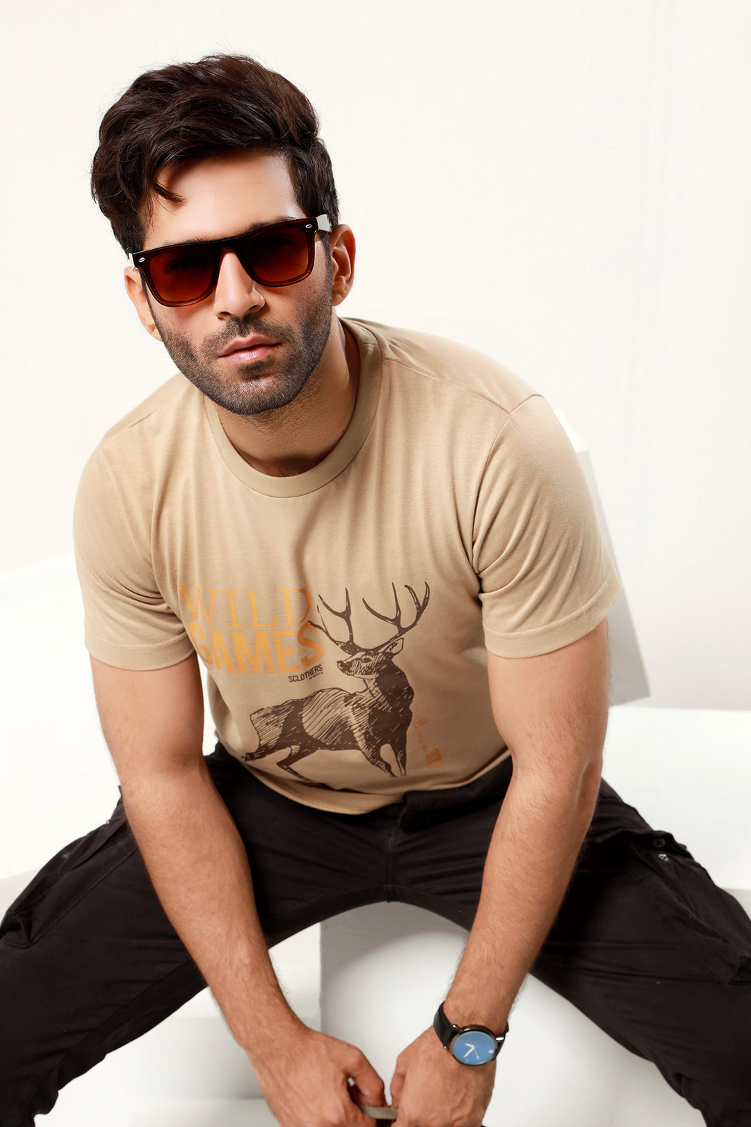 Crafted in cotton jersey knit fabric, adorned with a deer print on the chest that represents instinctual energy and power along with Sclothers lucky number 93, is our camel brown wild games t-shirt. Revamp your wardrobe by adding this standout design to your collection.