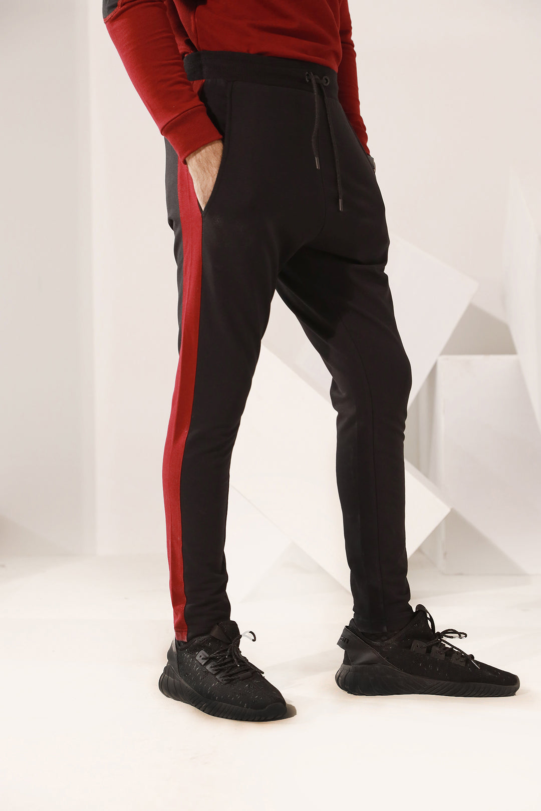 Constructed in textured terry knit fabric, our Black tapered trousers are decorated with a contrasting side stripe making this pair a modern essential in your wardrobe. Equipped with adjustable drawcords at the waist and side pockets displayed on each side, these trousers are a show-stealer.