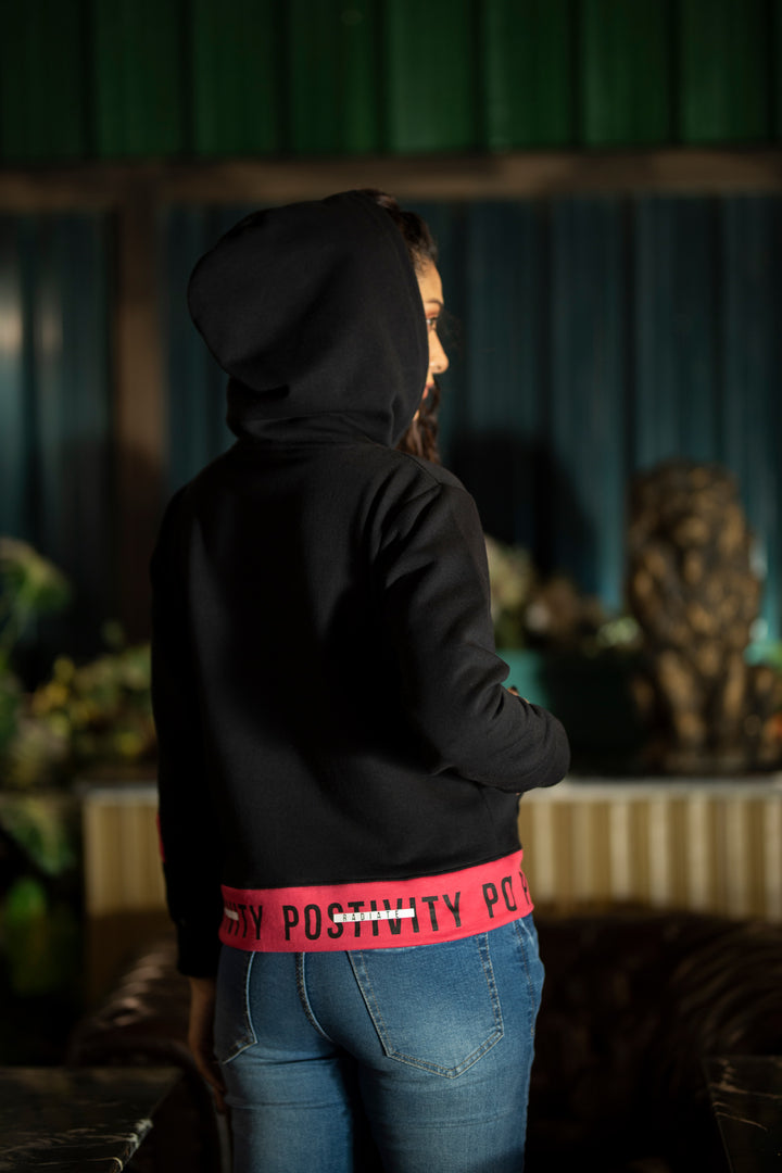 This Positive Vintage Black Hoodie is so cool, it features a V neck, Kangaroo-style pockets, long sleeves with ribbed cuffs and finished with pink hem with motivational POSITIVITY printed in black.