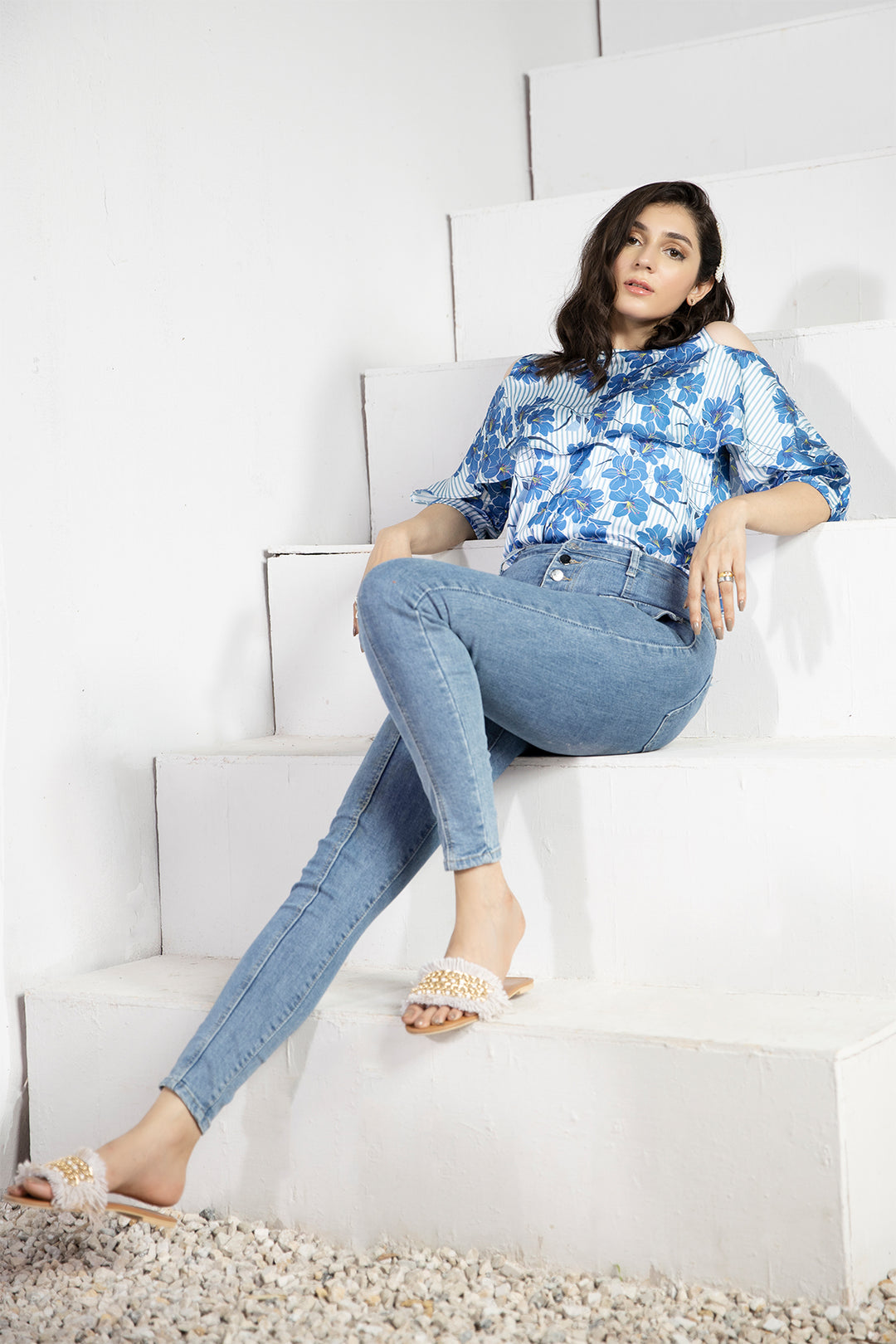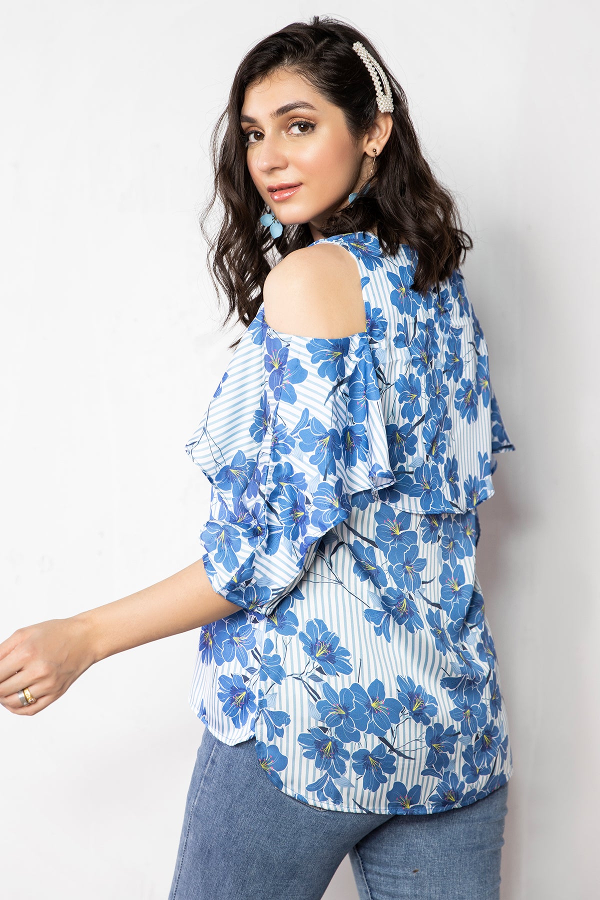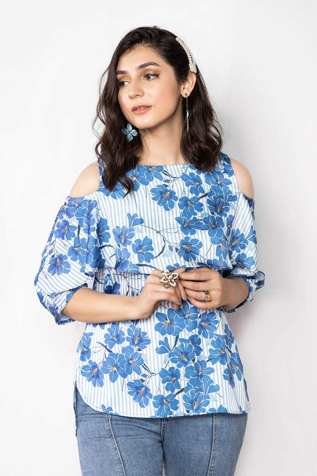 A seamless floral print perfectly unionized with comfortable fabric, this trendy cold shoulder top is going to be your next favorite. Style with your favorite comfy pants or go bold with some trendy palazzo pants, the possibilities are endless!
