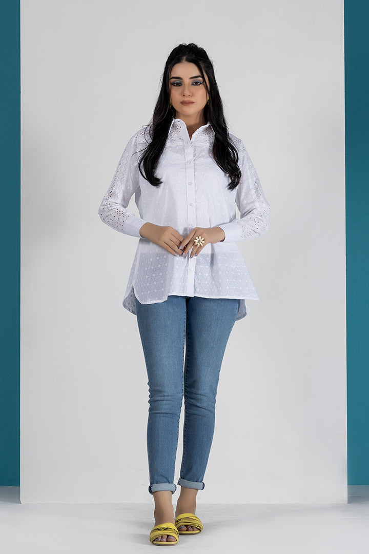 Made in Chikankari fabric with appliqued Embroidered Yoke, Button Down Placket, Shirt Collar, Cuff on Sleeves.